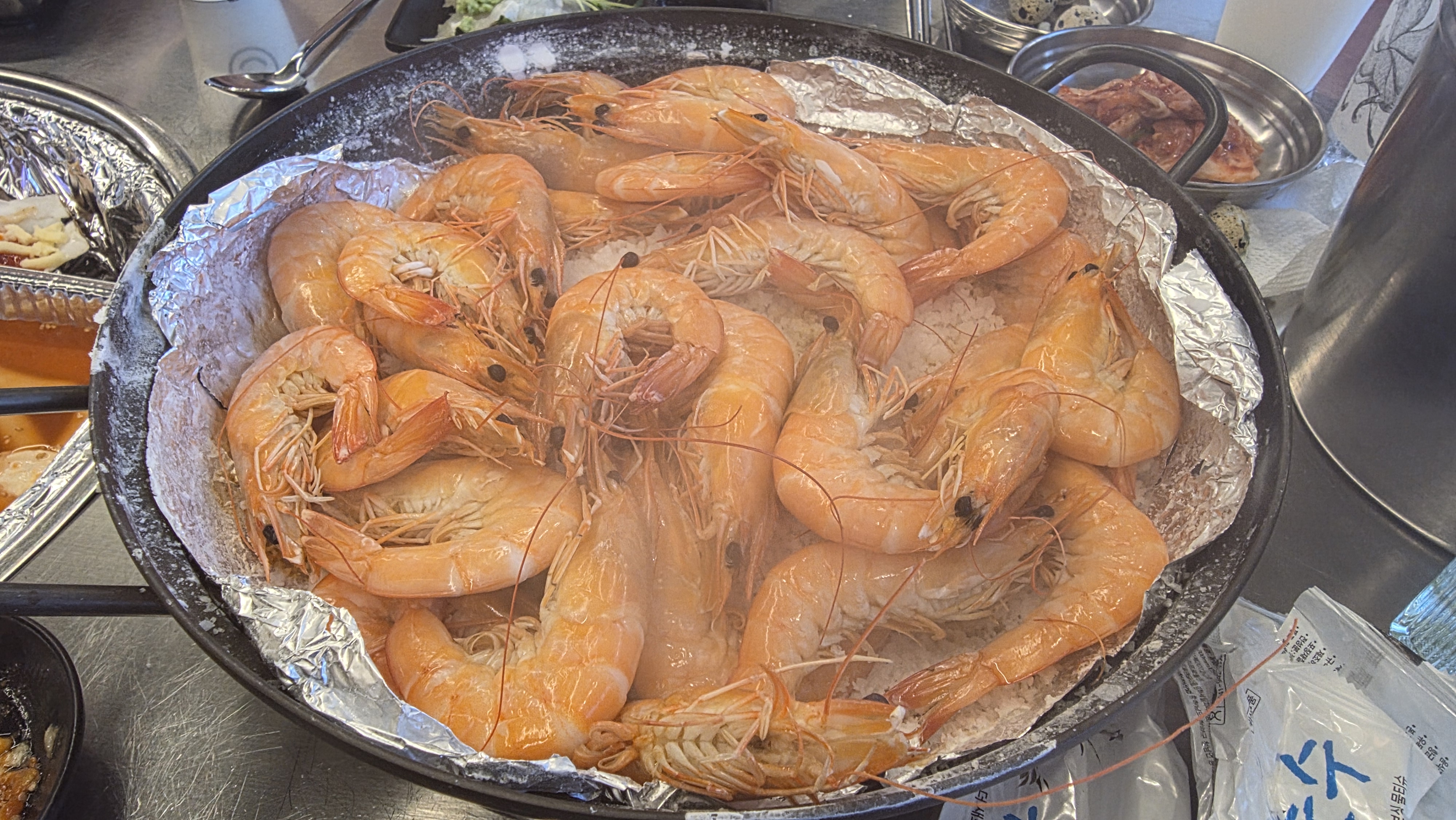 소금 위에 올려 쪄낸 새우는 살이 통통하고 단맛이 확 올라옵니다.